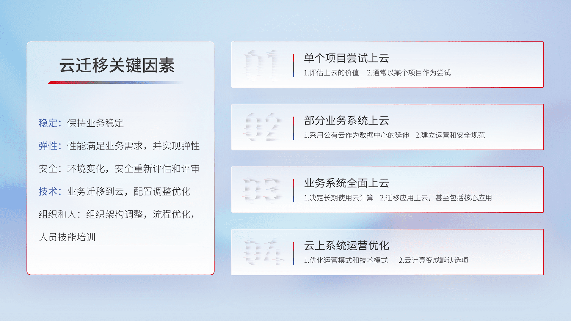 结合实际业务,,从规划设计、、、、云平台选型、、云原生改造、、数据迁移、、集成交付,,迁移全过程为客户识别最佳上云路径,,做好风险识别管理,,,设计网络架构、、、身份权限、、、、安全审计合规、、、、操作审计、、日志审计、、监控告警策略、、、、多站点容灾设计等,,,,对云上基础设施进行整体规划,,提升IT治理水平,,,以满足弹性、、高可用、、高性能的需求。。
