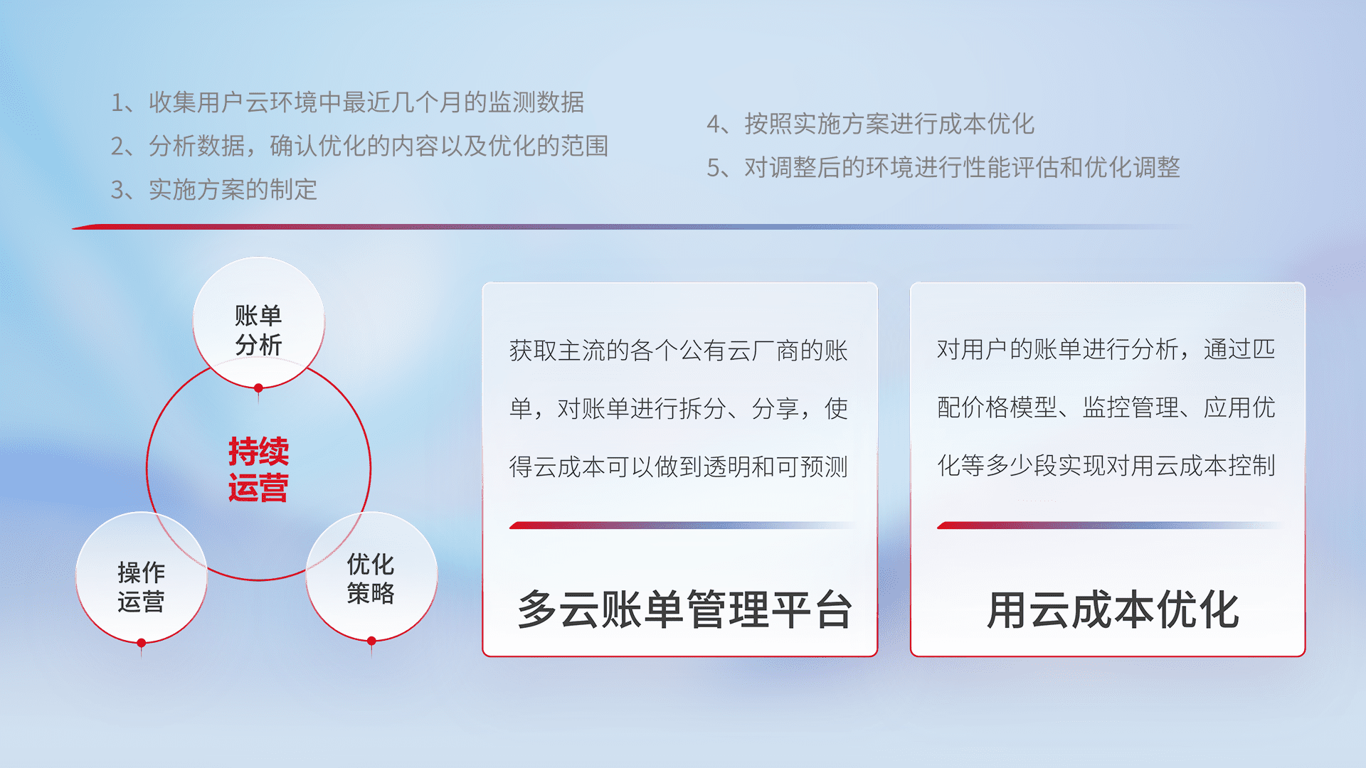 通过多云纳管,,,,以统一的资源数据模型把客户的云资源进行抽象和封装,,,,进而实现对多云资源的统一操作,,,保障云资源管理的可靠性、、、、稳定性与可用性。。量身定制化运维内容,,,配置、、、开发运维、、、、补丁管理、、、备份、、、监控、、认证和访问管理、、、审计和日常巡检等,,保障在用云过程中的可靠度,,,稳定度以及高可用率。。。