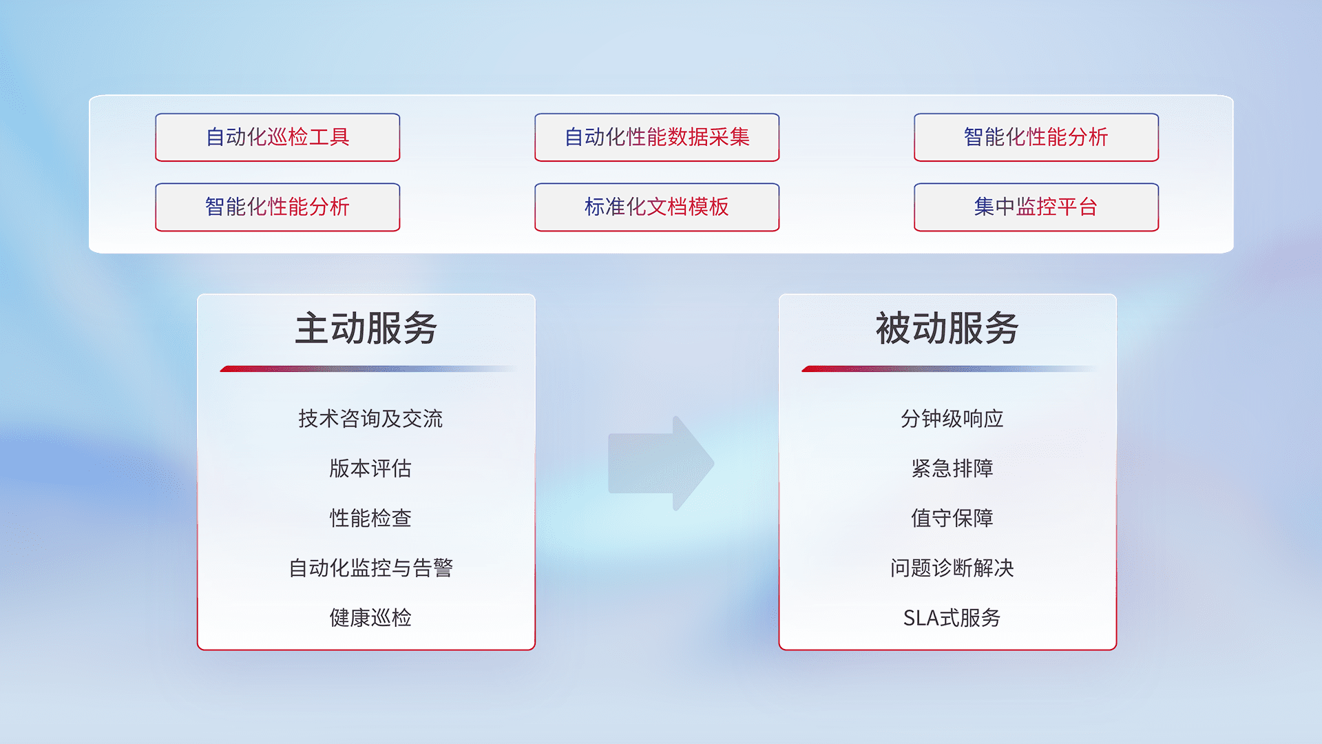 智能化工具和标准化文档,,保障服务质量,,,提供主动服务(包含技术咨询、、版本评估、、、、性能检查、、、自动化监控与告警、、、健康巡检)和被动服务包含(分钟级响应、、紧急排障、、、、值守保障、、、、问题诊断解决、、、、SLA服务)。。。