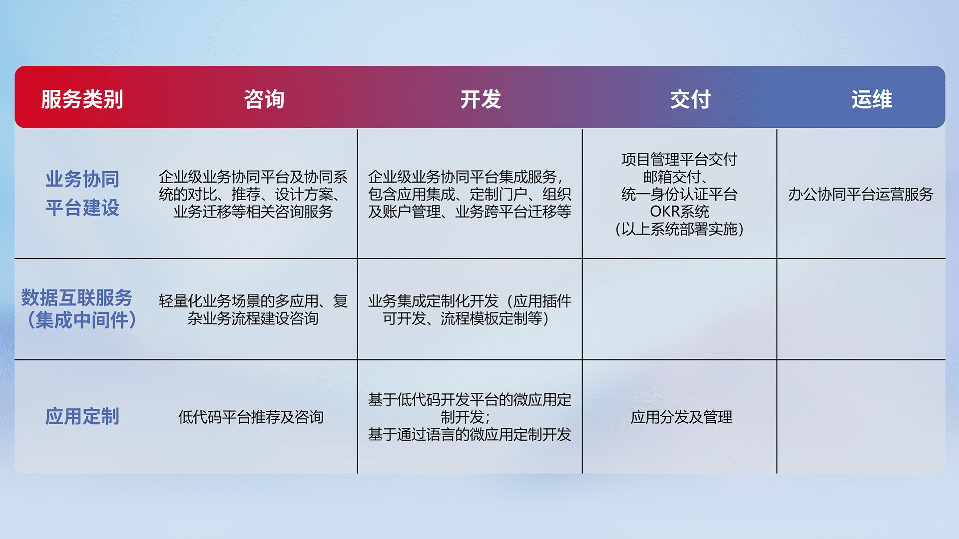 针对钉钉、、、企微、、、IDaas等平台级产品提供产品的规划、、、方案、、、交付、、定制化开发等服务,,,实现如统一协同办公、、、、智能客户服务、、、混合会议管理、、、智能数据查询、、等业务场景,,,实现数字化转型。。。。
